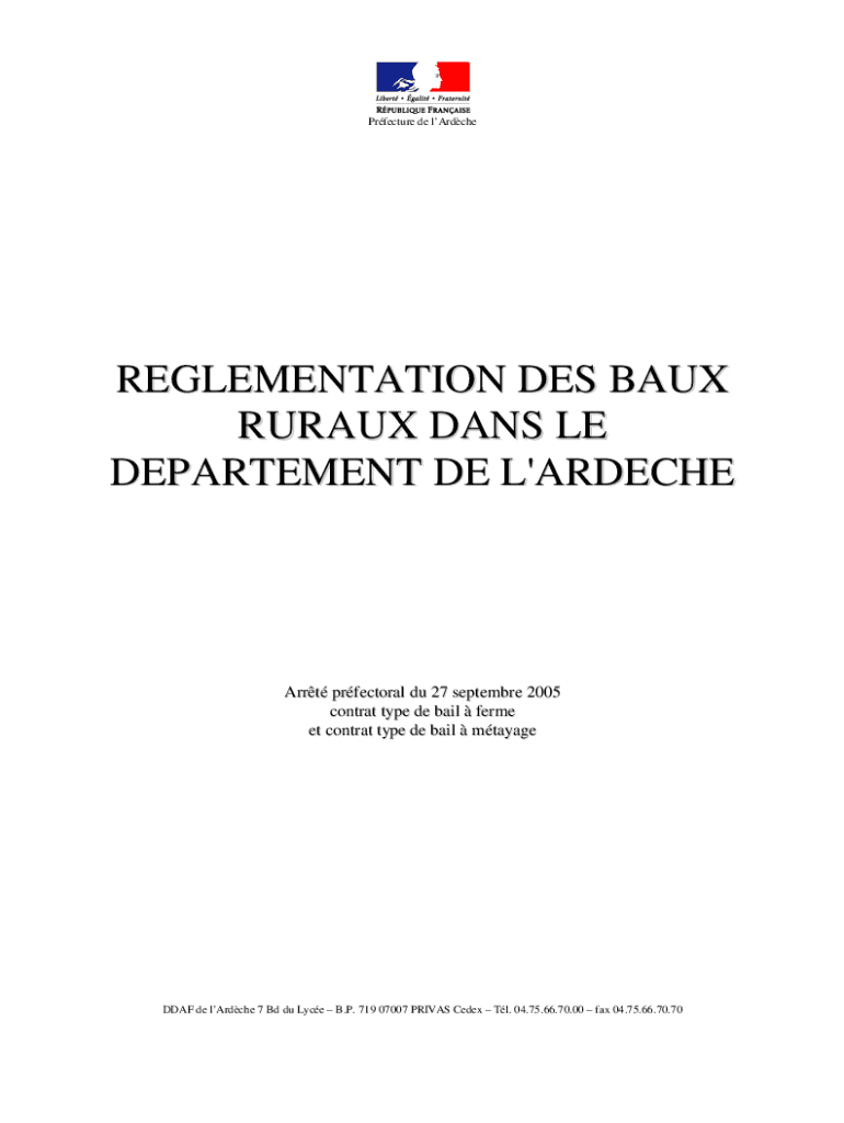 Prefecture de lArdcheREGLEMENTATION DES AUX RU RA U × D A N S LE DEPARTMENT DE L\'ARDECHEArrtpectorallDuu 27Septembere 2005contractt typed bailFermie contract typed bail mtayageDDAF démarche 7BDd