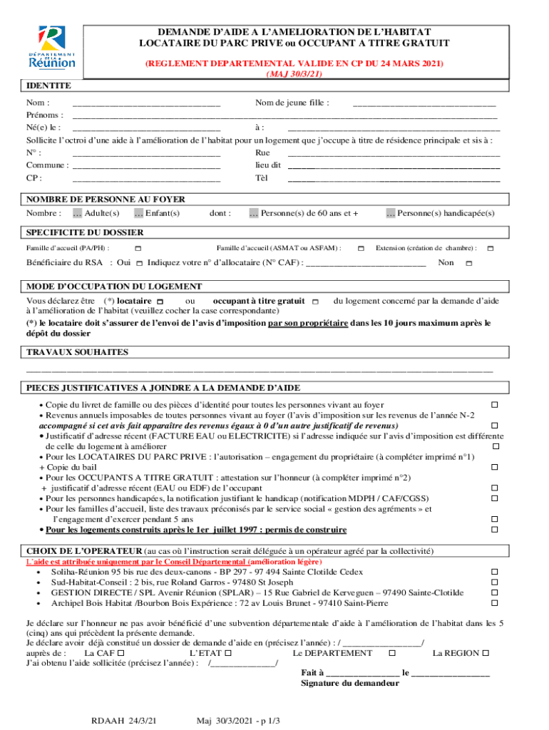 DEMANDED AIDE A AMELIORATION DEL HABITAT LOCATION DU PARC DRIVE of OCCUPANT A TITLE GRATUITY (REGALEMENT DEPARTMENTAL VALID EN CP DU 24 MARS 2021) (MAJ 30/3/21IDENTITYTNotom : __No tom dJunenfilele