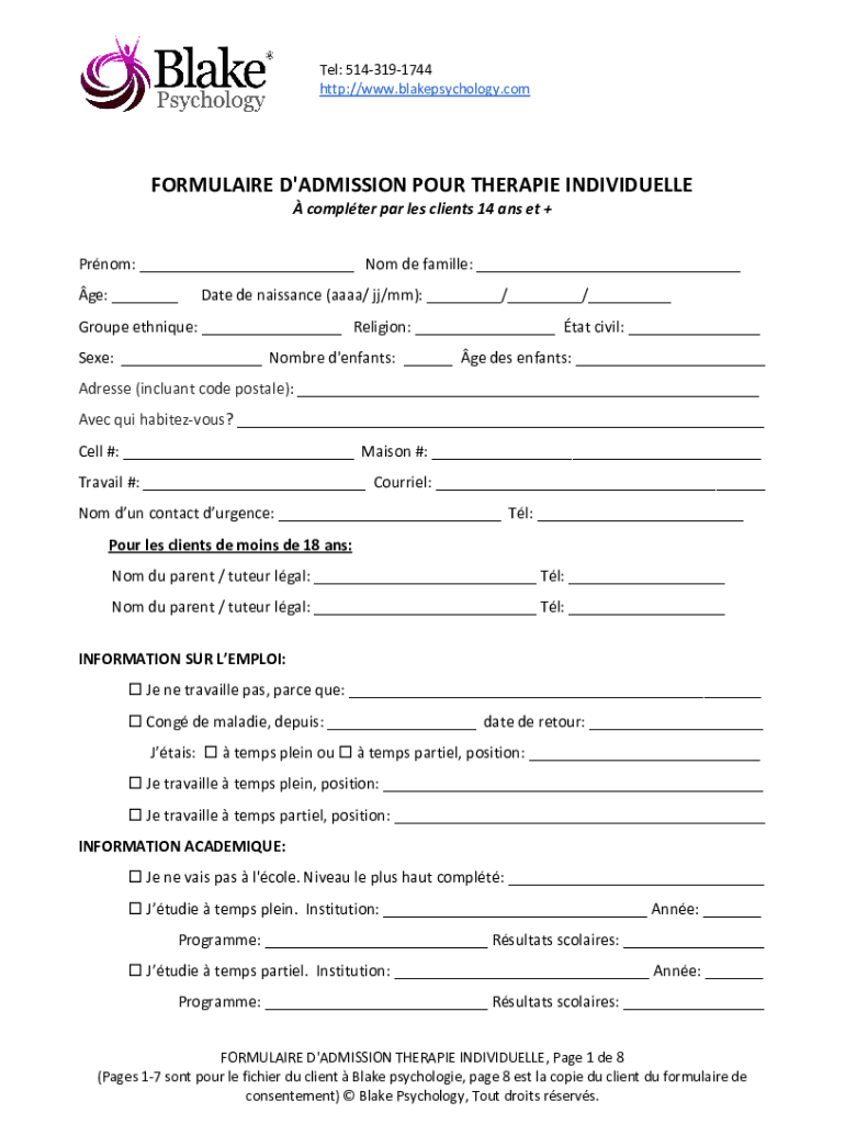Tel: 5143191744 http://www.blakepsychology.comFORMULAIRE D\'ADMISSION POTHERAPIESPINDIVIDUALLYLcomputerter presses clients a set etPromnom: _Noted Camille: _GE: ___Date RenaissancencAAAAaaJJ/ JJ/mm):