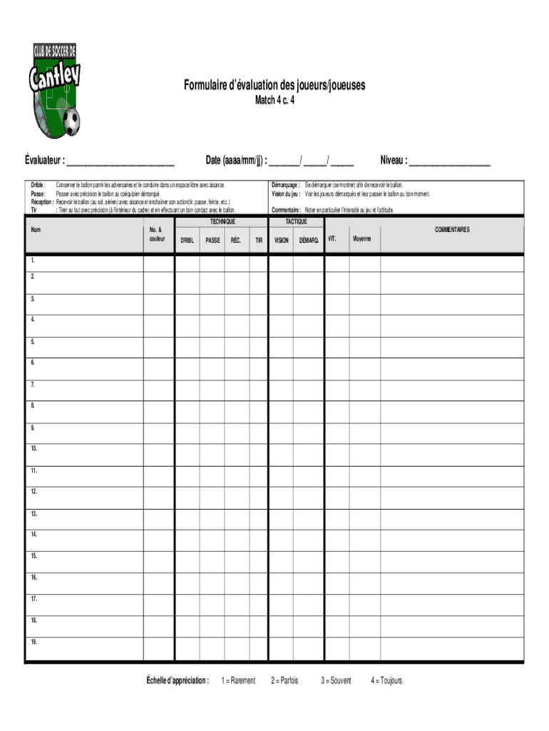Formula ire evaluation DES jokers/coleuses Match 4 c. 4valuateur : ___ Dribble : Passé : Reception : Pirate (AAAA/mm/JJ) : ___/ ___/ ___Conserved LE ballot CARMI LES adversaries et LE conducive day