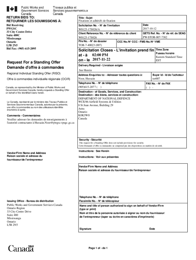 11RETURN BIDS TO: RETURNER LES COMMISSIONS :Title Outbid Receiving PW GSC 33 City Center Drive Suite 480C Mississauga Ontario L5B 2N5 Bid Fax: (905) 6152095Solicitation No. N de l\'invitationDateW012517S026/A20171012Client