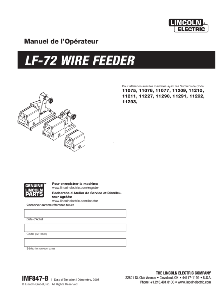 Manuel de lOprateurLF72 WIRE FEEDER Pour utilization Alec LES machines plant LES Numerous DE Code:11075, 11076, 11077, 11209, 11210, 11211, 11227, 11290, 11291, 11292, 11293,Pour unregister la machine: