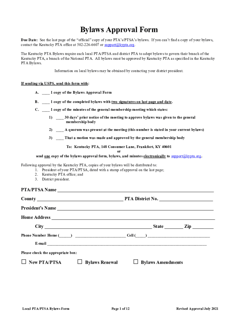 Bylaws Approval Form Due Date: See the last page of the official copy of your PTA's/Pass bylaws. If you can't find a copy of your bylaws, contact the Kentucky PTA office at 5022266607 or support@kypta.org.