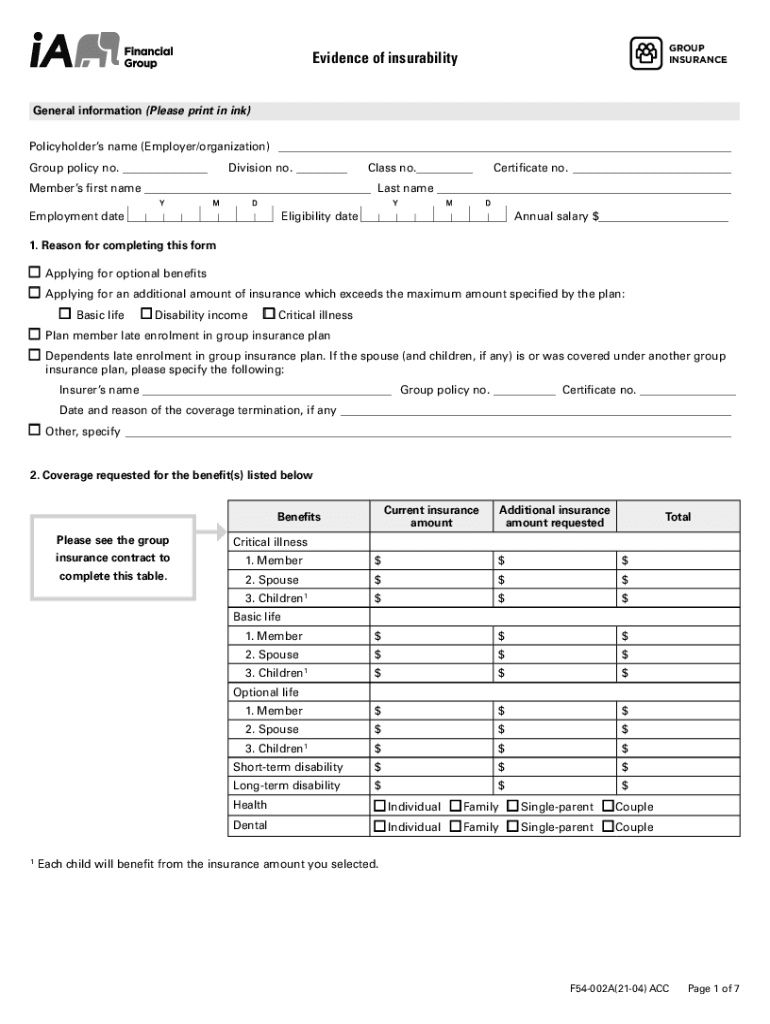 GROUP INSURANCEEvidence of insurability General information (Please print in ink)Policyholders name (Employer/organization) ___ Group policy no. ___Division no. ___Class no.___Certificate no.___Members