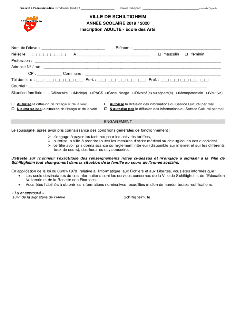 Serve administration : N dossier Camille : ___Dossier trait par : ___ (not DE agent)VILLA DE SCHILTIGHEIM ANNE CLAIRE 2019 / 2020 InscriptionADULTEColeeDESsArtsm deliver : ___ N(e)Lee : |__|__||__|__|