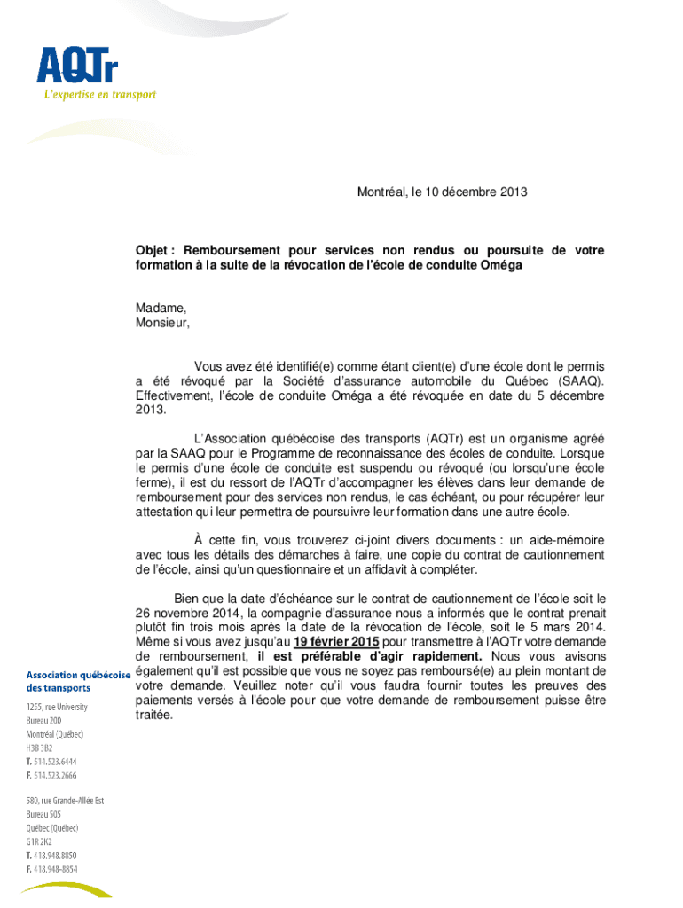 Montreal, LE 10 December 2013Objet : Reimbursement pour services non rends of pour suite DE vote formation la suite DE la vocation de Cole de conduit Olga Madame, Monsieur, Vows ave t identify(e)