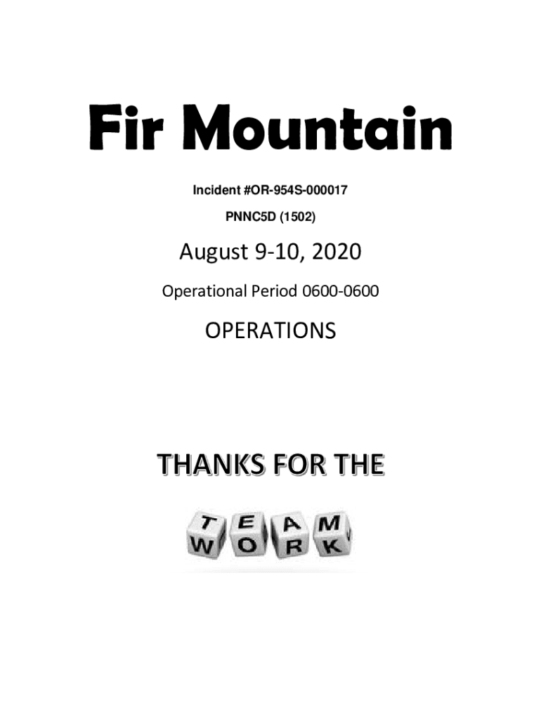 Fir Mountain Incident #OR954S000017 PNNC5D (1502)August 910, 2020 Operational Period 06000600OPERATIONS1. Incident nameINCIDENT OBJECTIVES2. Dater Mountain80820203. Time18004. Operational Period Sunday