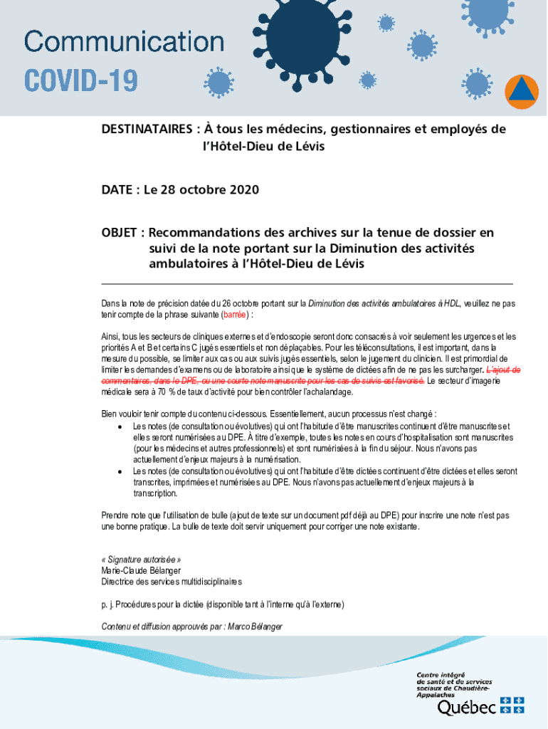 DESTINATIONS : tousles myelins, questionnaire set employs de lHtelDieu de Elvis DATE : Le 28 October 2020 OBJECT : Recommendations DES archives SUR la tenure DE dossier en soon DE la note portent
