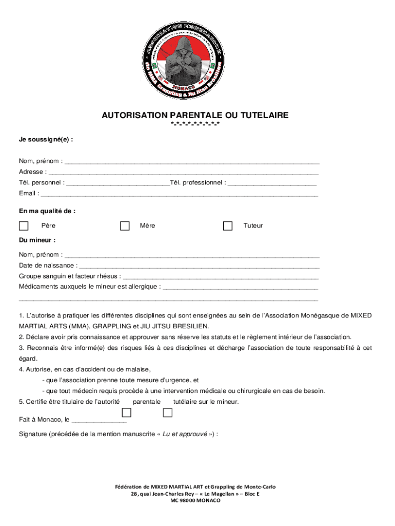 AUTHORIZATION PARENTAL OF TUTELAGE ********* JE sous sign(e) :Not, prom : ___ Address : ___ Tl. personnel : ___Tl. Professional : ___ Email : ___ En my quality DE : PreMreTuteurDu miner : Not, prom