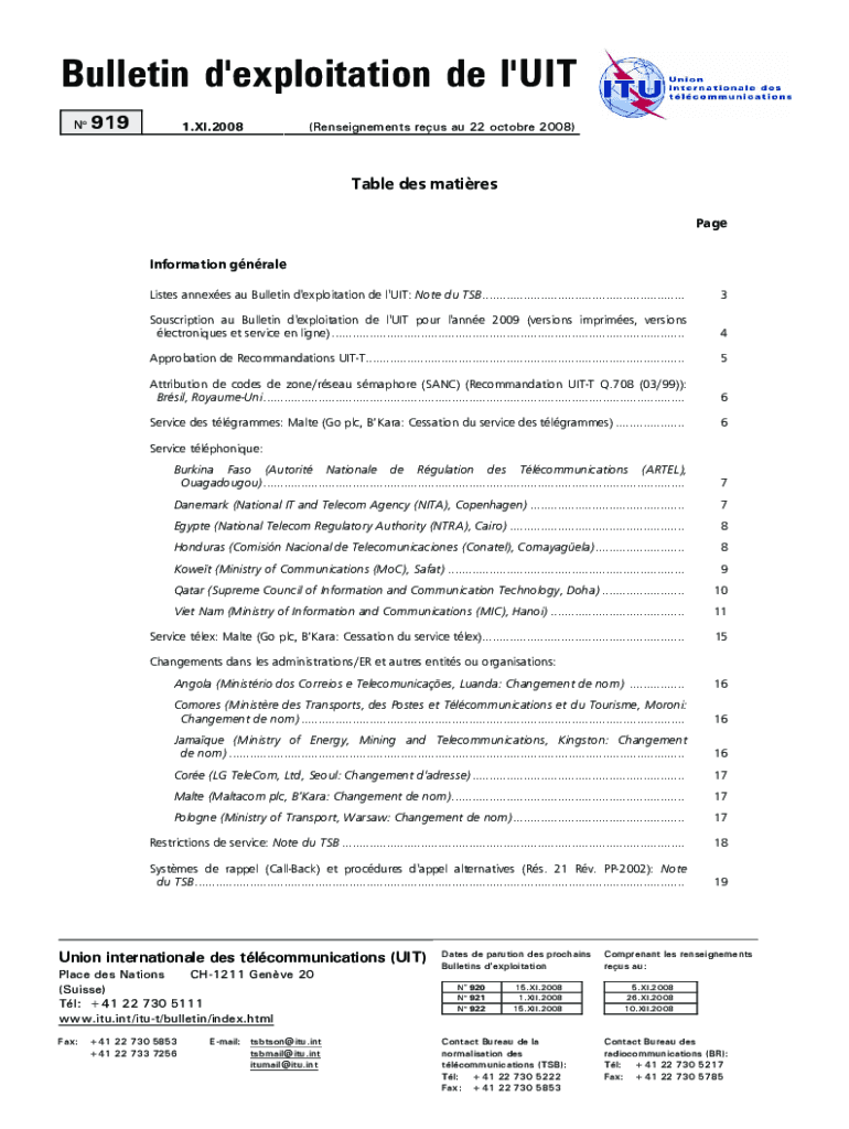 Bulletin d\'exploitation de l\'UIT No9191.XI.200RestatementstZeusuAUau 2Octoberre 2008)TablDESematureses Page InformatioGRALElListedes annexeAuau Bulletin d\'exploitation de l\'UIT: Note du TSB...........................................................3SouscriptAUn