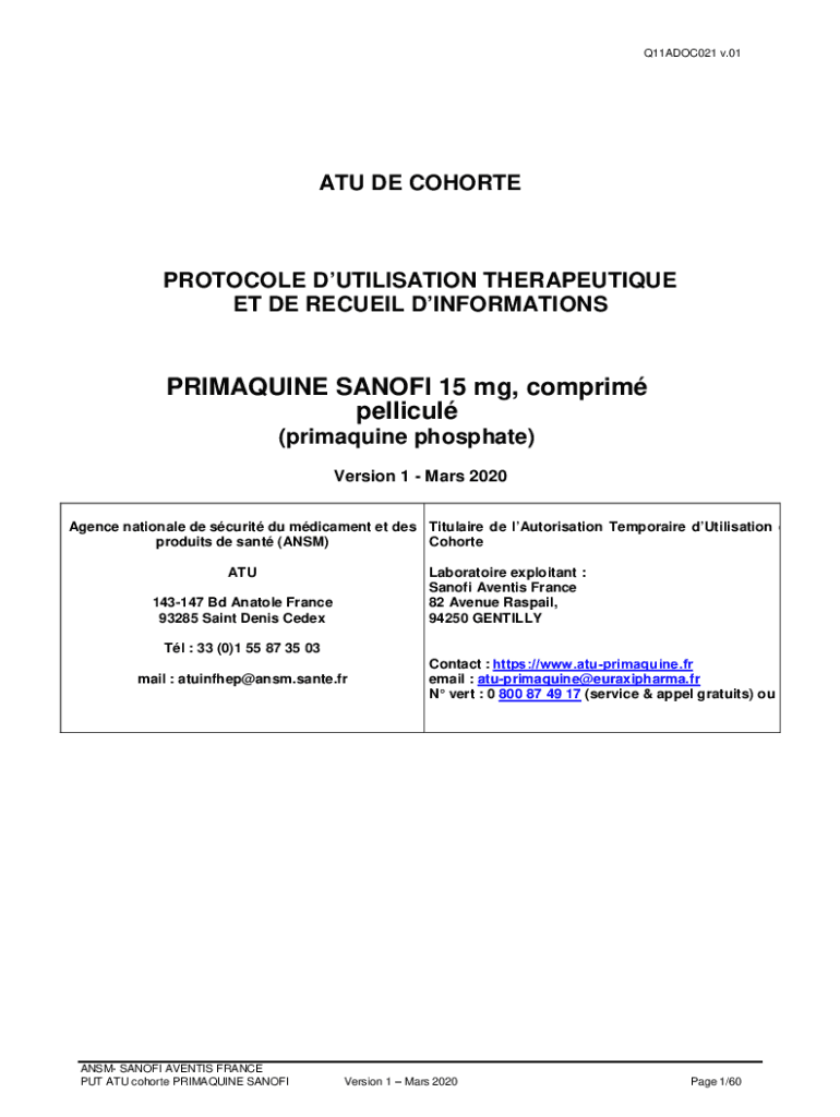 Q11ADOC021 v.01ATU DE COHORTEPROTOCOLE UTILIZATION THERAPEUTIC ET DE RECOIL DINFORMATIONSPRIMAQUINE SANOFI 15 mg, com prim helical (phosphate) Version 1 Mars 2020 Agency national DE security Du medicament