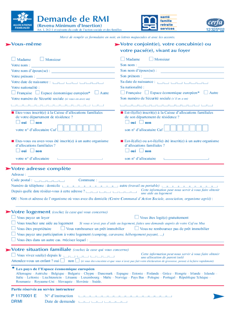 Demand de RMI (Revenue Minimum insertion)12325×02Art. L 2621 ET servants Du code DE action social et DES famillesMerci de repair CE formula ire en noir, en letters majuscule set Alec LES accents.