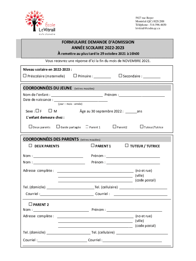 5927 rue Boyer Montreal (QC) H2S 2H8 Tl phone : 5145964650 levitrail@csdm.qc.caFORMULAIRE DEMANDED ADMISSION ANNE CLAIRE 20222023 resettle AU plus tard LE 29 October 2021 16h00 Vows received one response