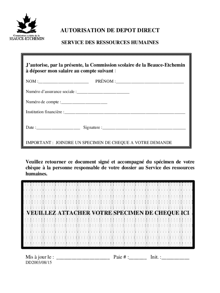 AUTHORIZATION DE DEPOT DIRECT SERVICE DES RESOURCES HUMAINESJautorise, par la present, la Commission Claire de la BeauceEtchemin poser Mon salary AU compete servant : NOT :___PROM :___Humor assurance