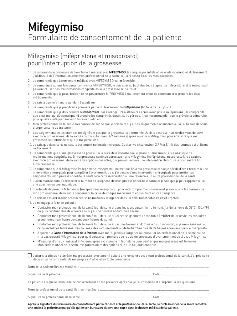 MifegymisoFormulaire de contentment DE la patients Mifegymiso (misprision ET) pour interruption DE la grosses 1. JE comp rends LE processes DE divorcement medical Alec MIFEGYMISO, LES risqué potential