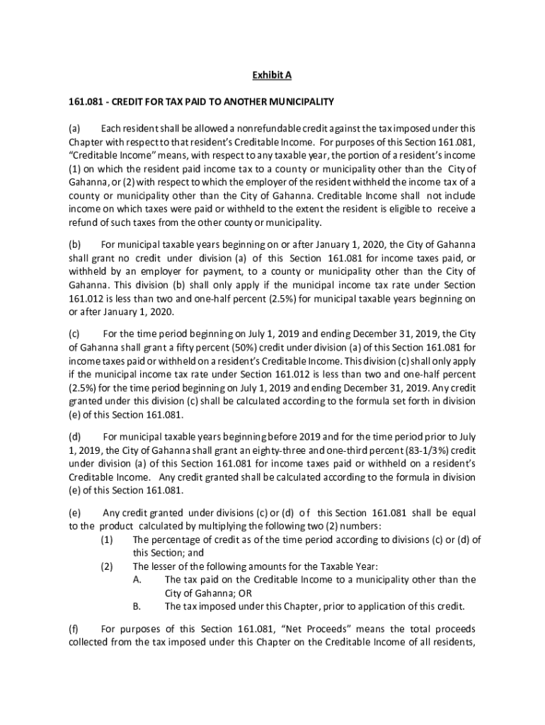 Exhibit A 161.081 CREDIT FOR TAX PAID TO ANOTHER MUNICIPALITY (a) Each resident shall be allowed a nonrefundable credit against the tax imposed under this Chapter with respect to that residents Creditable