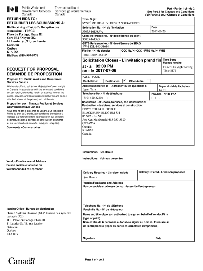Part Parties 1 of DE 2 See Part 2 for Clauses and Conditions Void Parties 2 pour Clauses et Conditions1 1RETURN BIDS TO: RETURNER LES COMMISSIONS :Title Outbid Receiving PW GSC / Reception DES sou