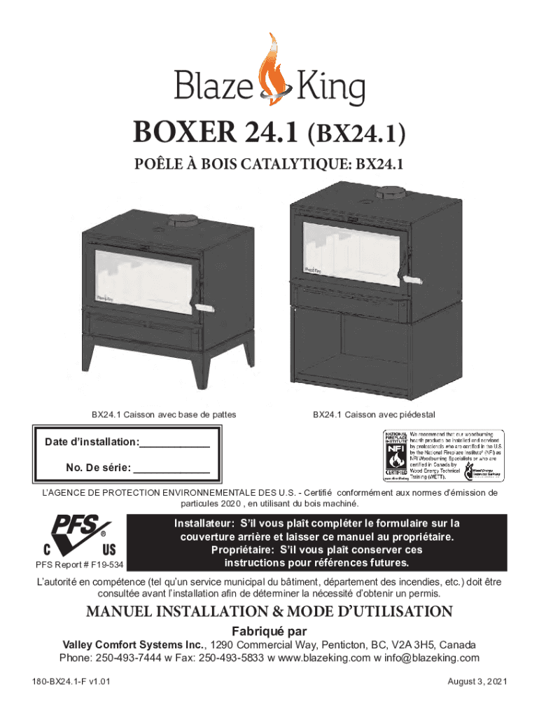 BOXER 24.1 (BX24.1) POLE BOYS CATALYTIC: BX24.1BX24.1 Caisson Alec base de pattesBX24.1 Caisson Alec pidestalDate installation:___ No. De Erie: ___ AGENCY DE PROTECTION ENVIRONMENTAL DES U.S. Certify