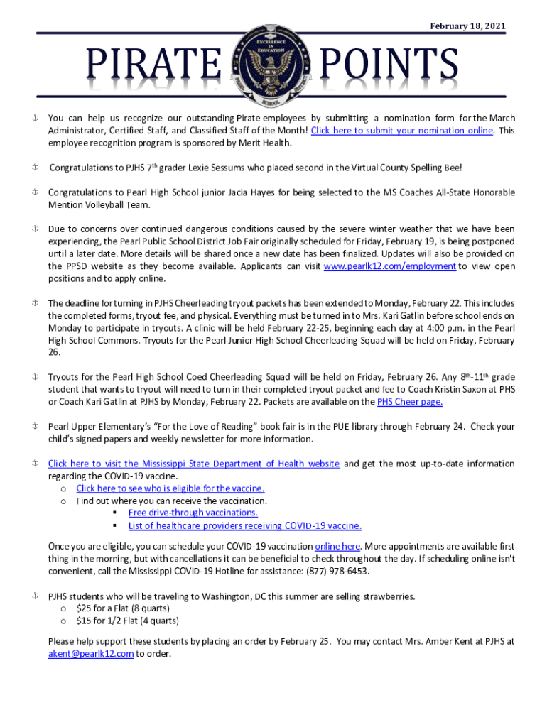 February 18, 2021PIRATEPOINTSYou can help us recognize our outstanding Pirate employees by submitting a nomination form for the March Administrator, Certified Staff, and Classified Staff of the Month!