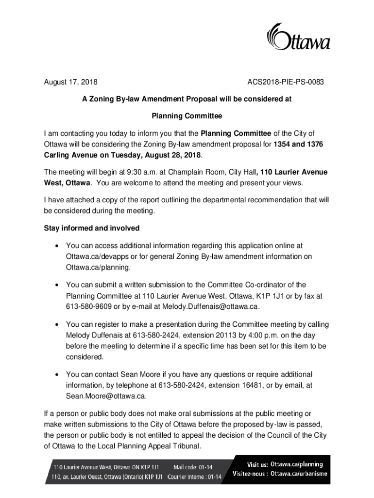 August 17, 2018ACS2018PIEPS0083A Zoning Bylaw Amendment Proposal will be considered at Planning Committee I am contacting you today to inform you that the Planning Committee of the City of Ottawa