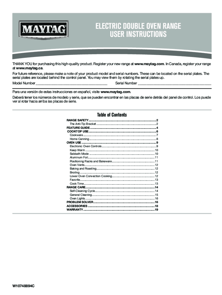 ELECTRIC DOUBLE OVEN RANGE USER INSTRUCTIONSTHANK YOU for purchasing this high quality product. Register your new range at www.maytag.com. In Canada, register your range at www.maytag.ca. For future
