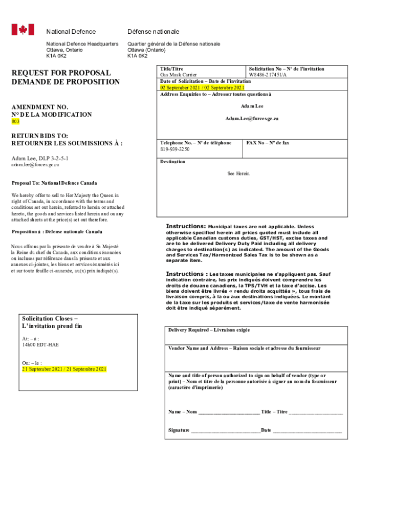 National DefenceDfense nationaleNational Defense Headquarters Ottawa, Ontario K1A 0K2Quartier gnarl DE la Defense national Ottawa (Ontario) K1A 0K2REQUEST FOR PROPOSAL DEMAND DE PROPOSITIONTitle/Title