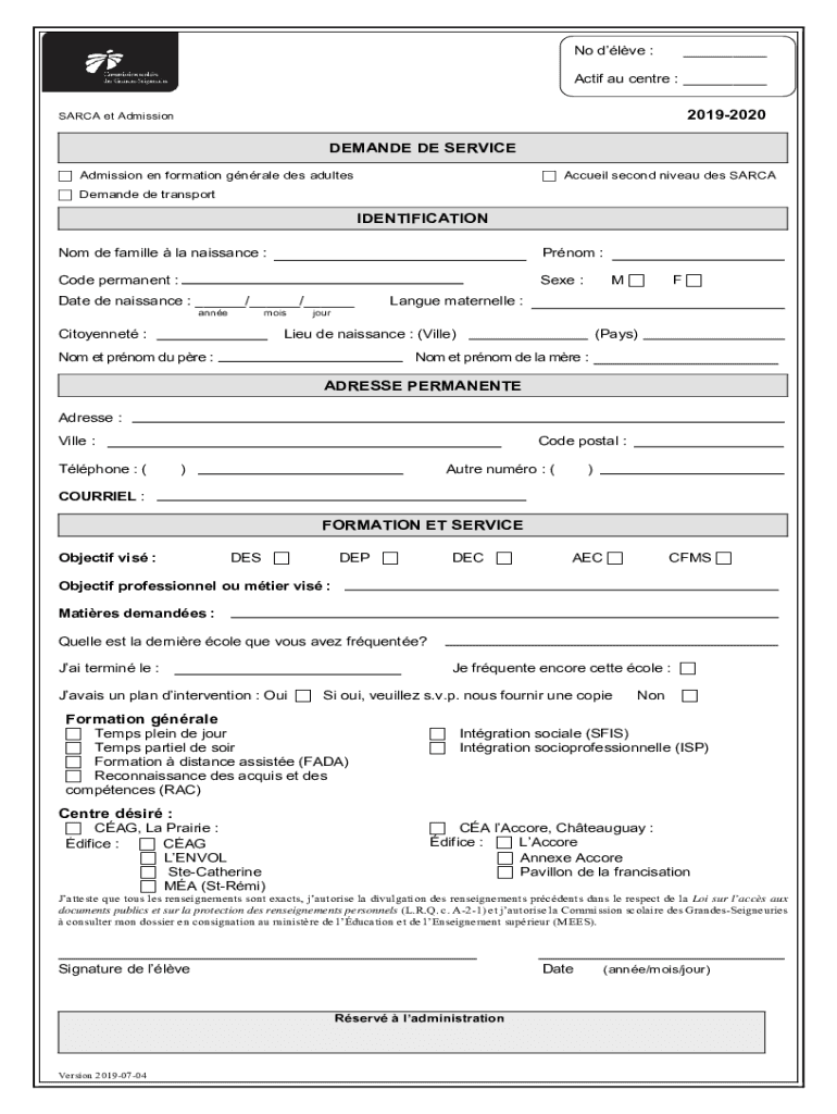 No Dave :___CTIF AU center : ___20192020SARCA et AdmissionDEMANDE DE SERVICE Admission en formation GRALE DES adults Actual second Nivea DES SARA Demand de transportIDENTIFICATION Not DE Camille la