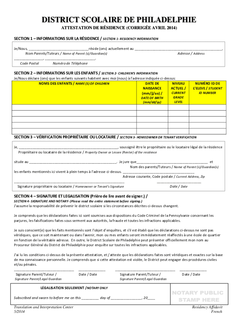 DISTRICT CLAIRE DE PHILADELPHIA ATTESTATION DE RESIDENCE (CORRIE APRIL 2014) SECTION 1 Information SUR LA RESIDENCE / SECTION 1 RESIDENCY Information/Nous, _sidedeONSns) actuellemenAUau ___No tom