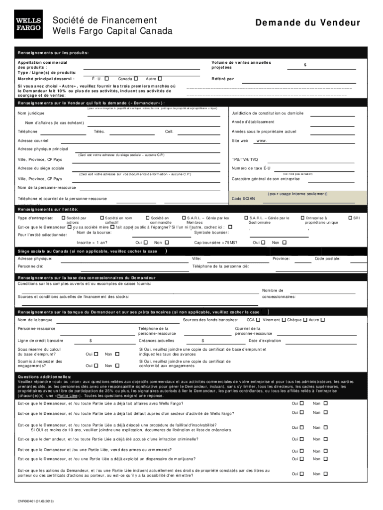 So cit DE Advancement Wells Fargo Capital CanadaDemande du VendeurRenseignements SUR LES products: Appellation commercial DES products : Type /Line(s) DE products:Volume DE vents annulled projetesMarch