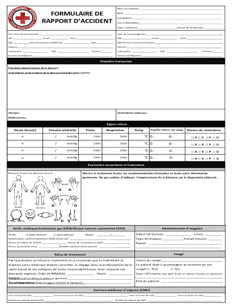 Le formulaire de rapport d'accident doit être rempli en indiquant les détails de l'accident, les blessures subies, les témoins présents et toute autre information pertinente.