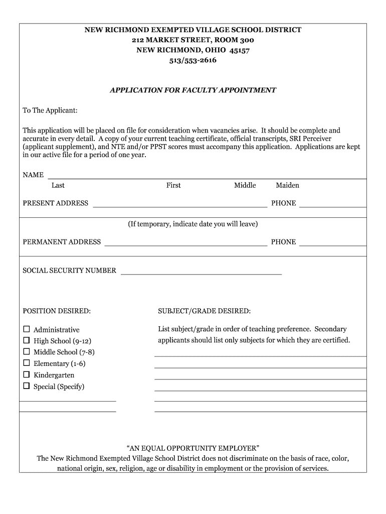 NEW RICHMOND EXEMPTED VILLAGE SCHOOL DISTRICT 212 MARKET STREET, ROOM 300 NEW RICHMOND, OHIO 45157 513/5532616 APPLICATION FOR FACULTY APPOINTMENT To The Applicant: This application will be placed