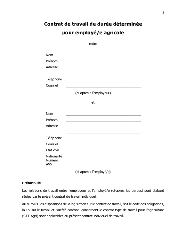 1Contrat de travail DE due determine pour employ/eAgricolaeentireeNotmPromm AdresseTlphoneCourierl cars :employer)ETtNotmPromm AdresseTlphoneCourierlEatt civilNationalisttHumoro AVS cars :employ/preamble