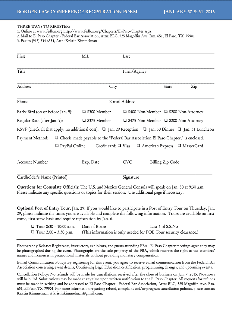 BORDER LAW CONFERENCE REGISTRATION FORM JANUARY 30 & 31, 2015 THREE WAYS TO REGISTER: 1. Online at www.fedbar.org http://www.fedbar.org/Chapters/El-Paso-Chapter.aspx 2. Mail to El Paso Chapter Federal