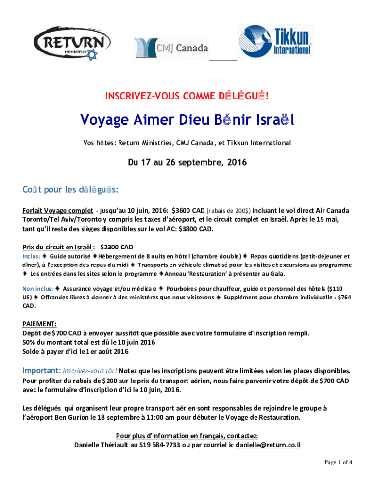 INSCRIVEZVOUS COME DLG! Voyage Aimed Died NIR Israel Los hates: Return Ministries, CMJ Canada, et Tikki International Du 17 au 26 September 2016 Cot pour LES plus: ForfaitVoyagecompletjusquau10juin,2016:$3600CAD(rabaisde$200)incluantlevoldirectAirCanada