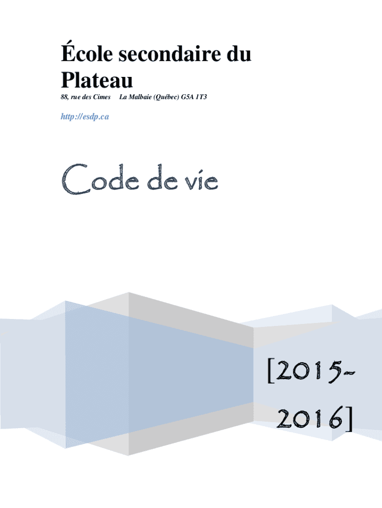 Cole secondary Du Plateau 88, rue DES CIMOSA Malware (Quebec) G5A 1T3http:/ESPdcodede de vie[20152016]TablDESematureseRuleses ...........................................................................................................................................................................