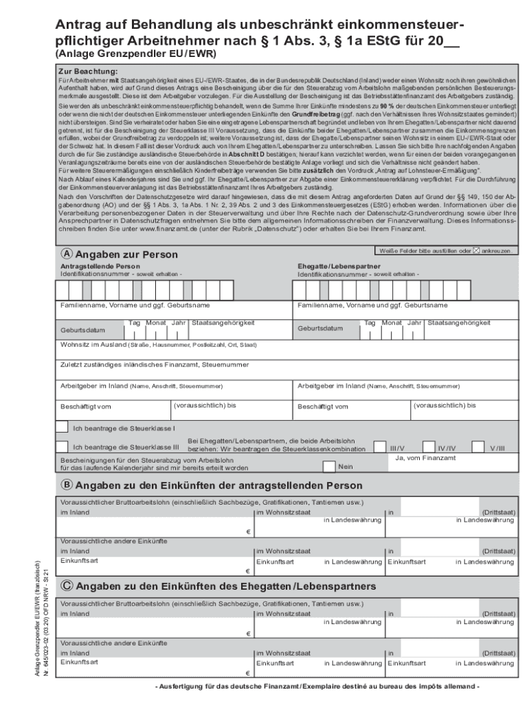 Ant rag AUF Rehandling ALS unbeschrnkt einkommensteuerpflichtiger Arbeitnehmer each 1 Abs. 3, 1a EST for 20__ (Engage Grenzpendler EU/EWR)OurrBeachinggForr ArbeitnehmerMITt Staatsangehrigkeitliness