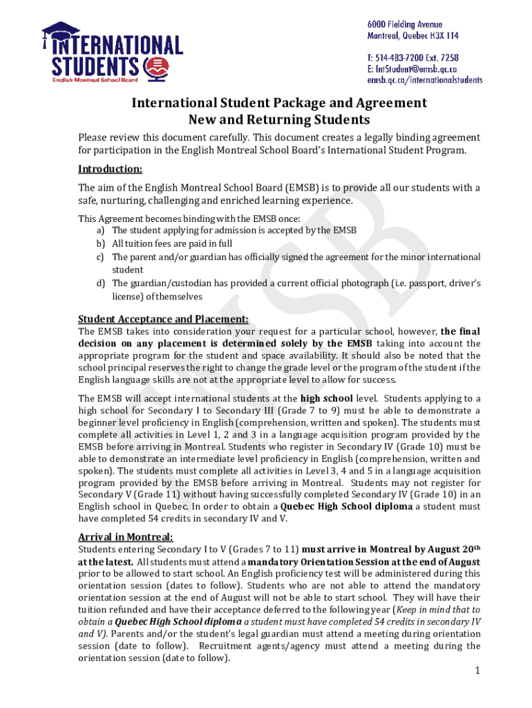 International Student Package and Agreement New and Returning Students Please review this document carefully. This document creates a legally binding agreement for participation in the English Montreal