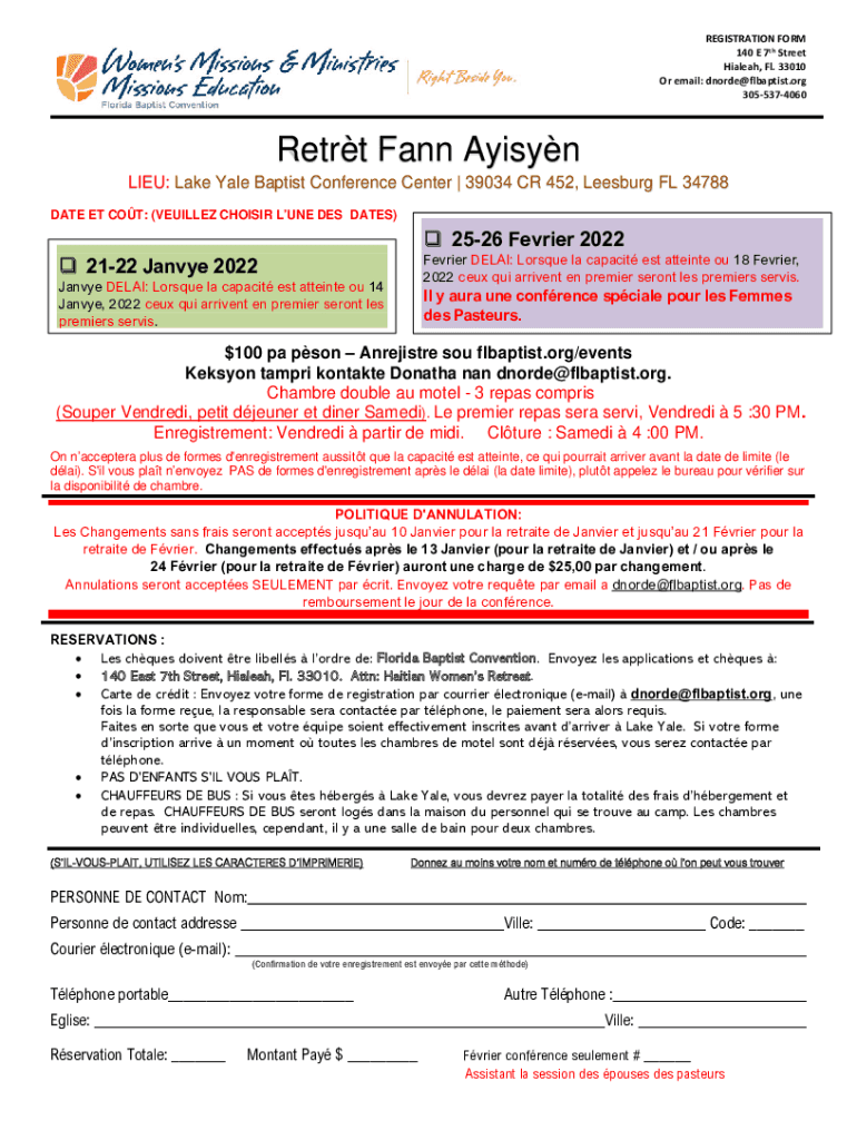 REGISTRATION FORM 140 E 7th Street Hialeah, Fl. 33010 Or email: dnorde@flbaptist.org 3055374060Retrt Fans Alison LIEU: Lake Yale Baptist Conference Center | 39034 CR 452, Leesburg FL 34788 DATE ET