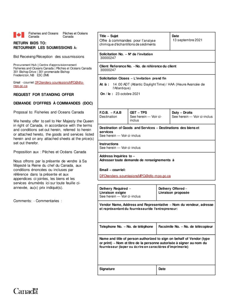 Title SujetRETURN BIDS TO: RETURNER LES COMMISSIONS : Bid Receiving/Reception DES sous missions Procurement Hub | Center dapprovisionnement Fisheries and Oceans Canada | Ache set Cans Canada 301 Bishop