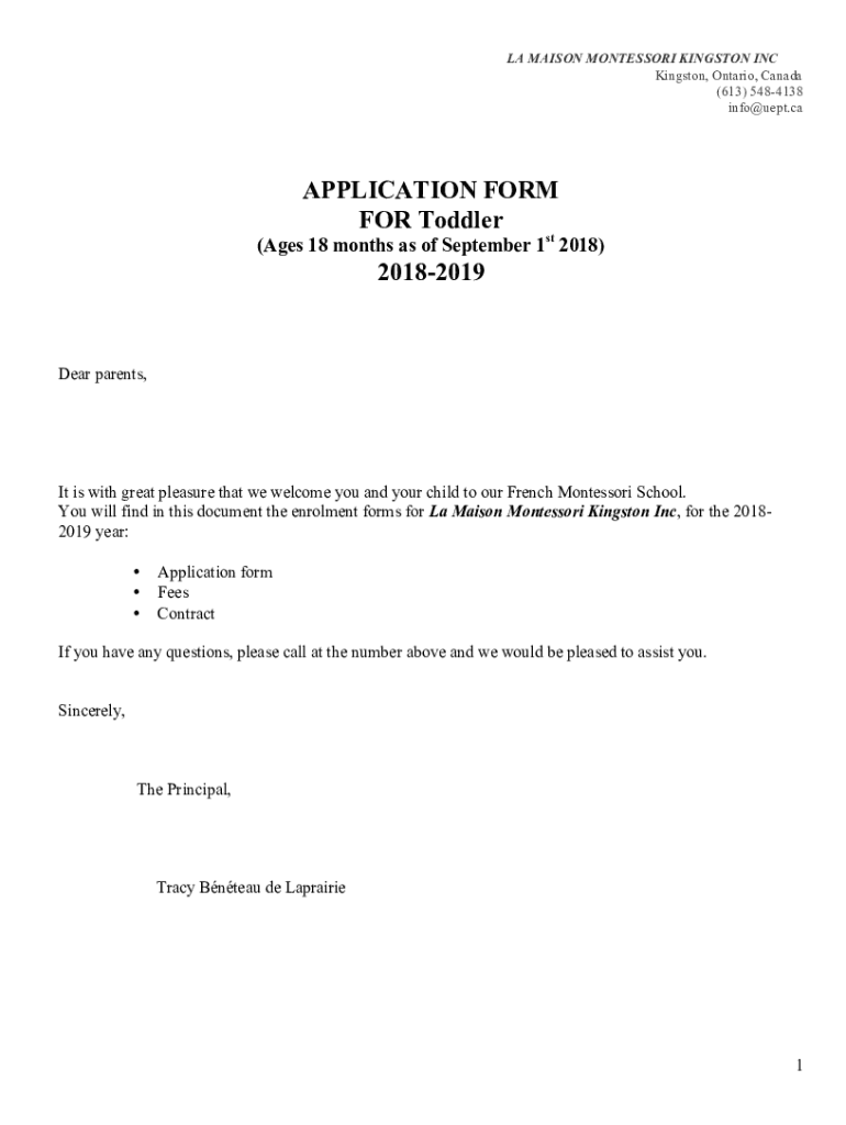 LA MADISON MONTESSORI KINGSTON INC Kingston, Ontario, Canada (613) 5484138 info@uept.caAPPLICATION FORM FOR Toddler(Ages 18 months as of September 1st 2018)20182019Dear parents, It is with great pleasure
