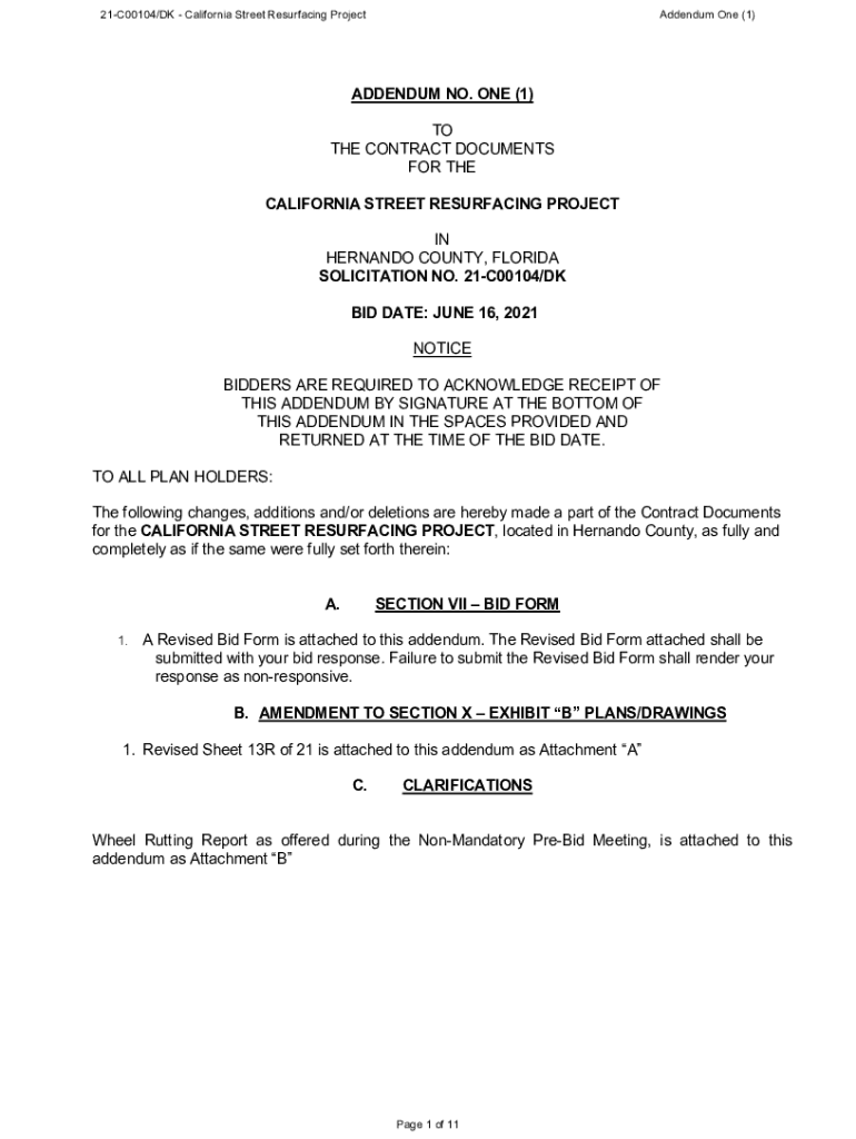 21C00104/DK California Street Resurfacing ProjectAddendum One (1)ADDENDUM NO. ONE (1) TO THE CONTRACT DOCUMENTS FOR THE CALIFORNIA STREET RESURFACING PROJECT IN HERNANDO COUNTY, FLORIDA SOLICITATION