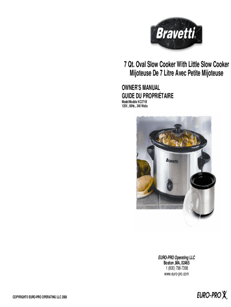 7 Qt. Oval Slow Cooker With Little Slow Cooker Mijoteuse De 7 Liter Alec Petite Mijoteuse OWNERS MANUAL GUIDE DU PROPRIETARY Model/Model KC271B 120V., 60Hz., 340 WattsEUROPRO Operating LLC Boston,
