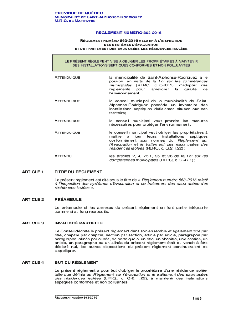 PROVINCE DE QUEBEC MUNICIPALITY DE SAINTALPHONSERODRIGUEZ M.R.C. DE MATAWINIERGLEMENT NU MRO 8632016 ELEMENT NU MRO 8632016 RELATED L\'INSPECTION DES SYSTEM D\'EVACUATION ET DE TREATMENT DESE AUX
