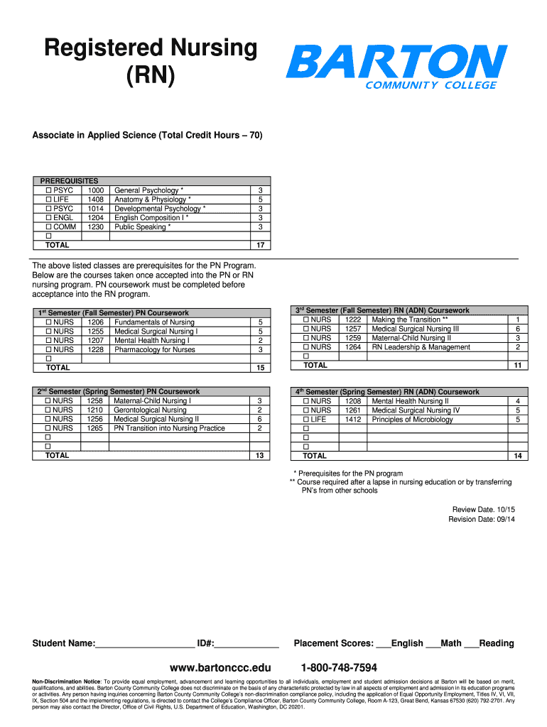 Registered Nursing (RN) Associate in Applied Science (Total Credit Hours 70) PREREQUISITES PSYCH 1000 LIFE 1408 PSYCH 1014 EGL 1204 COMM 1230 TOTAL General Psychology * Anatomy & Physiology * Developmental