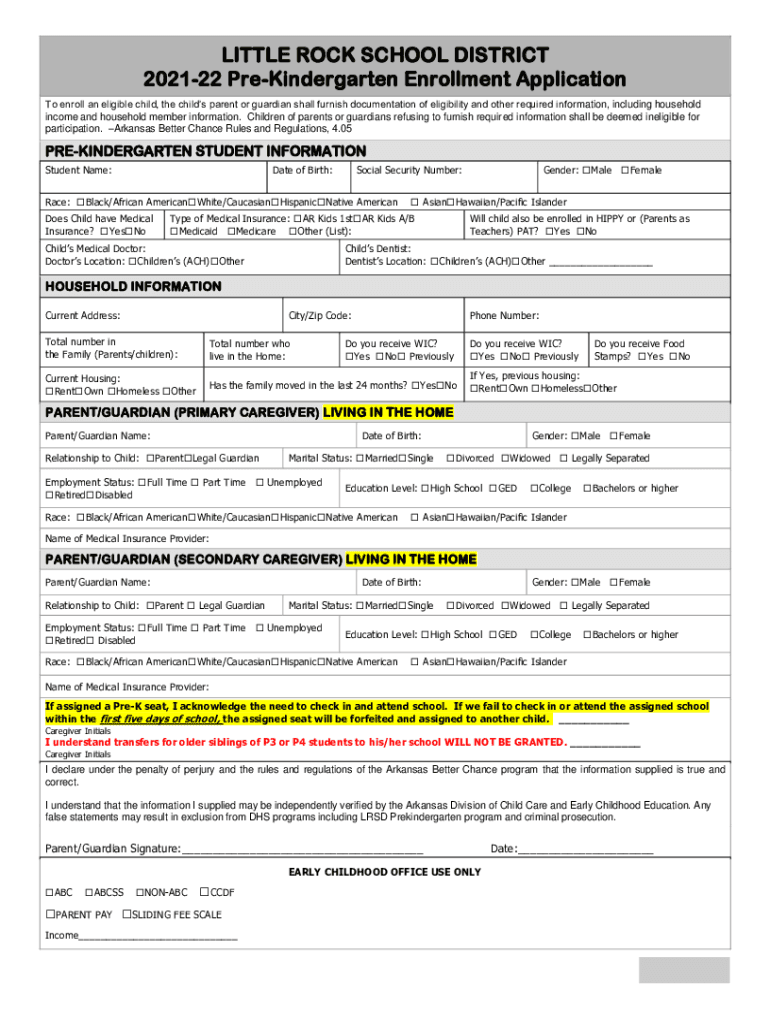 LITTLE ROCK SCHOOL DISTRICT 202122 PreKindergarten Enrollment Application To enroll an eligible child, the children parent or guardian shall furnish documentation of eligibility and other required