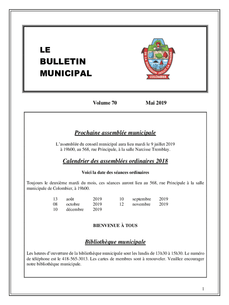 BULLETIN MUNICIPALVolume 70Mai 2019Prochaine assemble municipal Assemble Du Conrail municipal aura lieu Mari LE 9 bullet 2019 19h00, Au 568, rue Principal, la sale Narcissa Tremblay. Calendar DES
