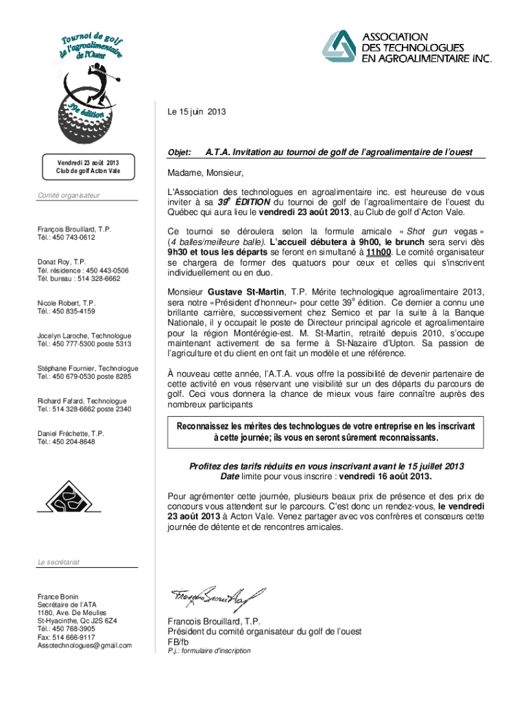 Le 15 join 2013Objet: Vended 23 AOT 2013 Club DE golf Acton ValeComit organisateurFranois Robillard, T.P. Tl.: 450 7430612 Donate Roy, T.P. Tl. residence : 450 4430506 Tl. bureau : 514 3286662 Nicole