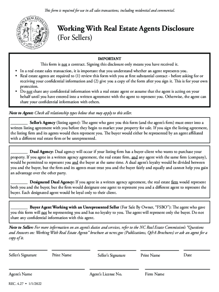 This form is required for use in all sales transactions, including residential and commercial. Working With Real Estate Agents Disclosure (For Sellers) IMPORTANTThis form is not a contract. Signing