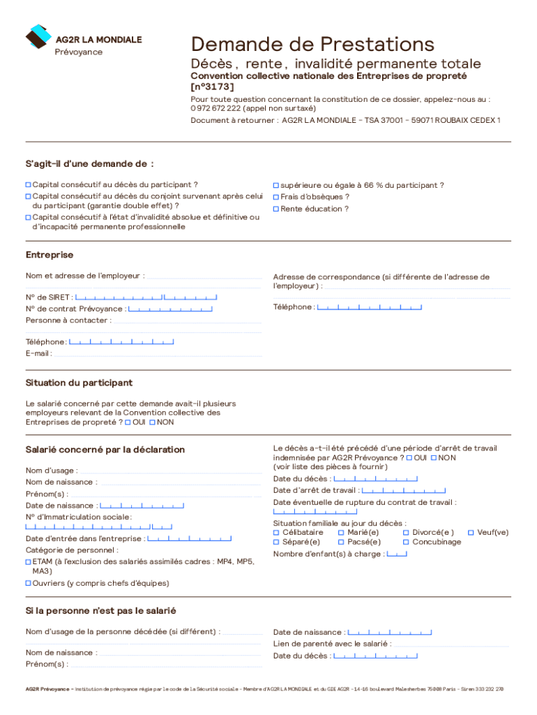 PrvoyanceDemande de PrestationsDcs, rent, invalidity permanent total Convention collective national DES Enterprises DE prophet [n3173]Pour route question concern ant la constitution de CE dossier,