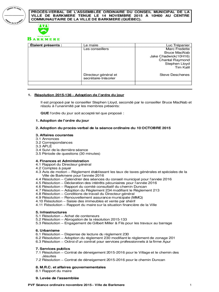 PROCÈS-VERBAL DE L\'ASSEMBLEORDINARYE CONSENT MUNICIPAL DE PAPILLAE DEBARKERETENUREE LE 14NOVEMBERE 2015 10H00 Accenture COMMUNAUTAIRE DE PAPILLAE DEBARKED QUEBEC)talenttpresentss :Remained Les conseillersDirecteurgnarll